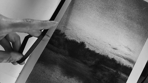 Первая попытка потерпела неудачу: я какого-то черта решила, что туманную дымку удастся лихо передать на А4 одной капиллярной ручкой. Выдержки не хватило, пришлось сдаться углю. Но не столько ценен результат, сколько процесс: от вспыхнувшей идеи до последнего «мазка». Помню, собирались мы тогда после рыбалки, тащили лодку в крутую горку, а позади — тишь, водная гладь и тонкая вуаль, тянущаяся с поля на другом берегу. Сделала пару кадров на память, чтобы поглазеть еще раз после. А для «после» не нашлось более удачного момента, кроме как посреди ночи...