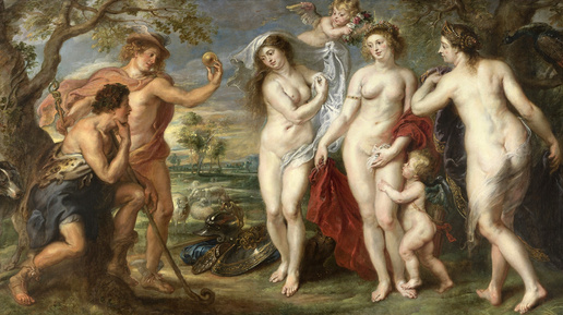 Перед нами картина великого фламандского живописца Питера Пауля Рубенса (1577–1640). Она изображает одну из любимейших тем художников — Суда Париса, который состоялся на свадьбе царя Пелея и нимфы Фетиды. Богиня разора Эрида решила позабавиться и создала золотое яблоко, достойное лишь самой прекраснейшей из богинь. Решать кто ею будет, было поручено Парису. И тот, после долгих размышлений отдал яблоко Афродите (Венере), получив взамен любовь Елены Прекрасной. Рубенс, как и другие художники, любил эту легенду и неоднократно иллюстрировал её...