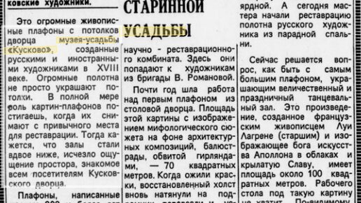 Читаем в архивах. "Плафоны старинной усадьбы". Статья о реставрации плафонной живописи Дворца, Вечерняя Москва. 1979 год