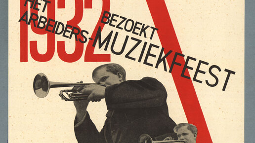 Плакат Нидерландского союза рабочих музыкальных объединений (Nederlandsche Bond van Arbeiders-Muziekvereenigingen), выполненный художниками Йоаном Лурсеном (Joan Lürsen) и Франсуа Элсеном (François Elsen). Плакат приглашает на Рабочий музыкальный фестиваль в Заандаме, 1932 год...