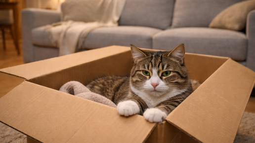 Кошка обиделась на новый диван и переехала жить в коробку. Диван был за 120 тысяч