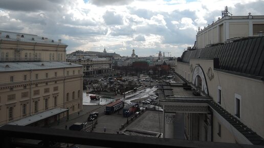 Если поднять голову, то практически под крышей вспомогательного корпуса, о котором я уже чуть-чуть рассказывала, можно увидеть полукруглые окошки. Из одного из них открывается вот такой вид на театральную площадь. Отсюда здорово снимать пролетающие самолеты в дни репетиций да и самого парада. А располагаются там... Тренажерный зал и массажный кабинет. Тренажерный зал артисты выбивали долго...