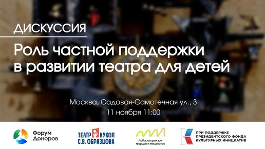 Дискуссия «Роль частной поддержки в развитии театра для детей» Дата и время: 11 ноября 11:00-13:00 Место: Государственный академический центральный театр кукол имени С.В. Образцова, Садовая-Самотечная ул., 3 Регистрация и подробности Форум Доноров организует экспертную дискуссию о частной поддержке театрального искусства для детей и юношества в партнерстве с Государственным академическим центральным театром кукол имени С.В. Образцова. В программу входит экскурсия и посещение музея театра. Приглашаем...