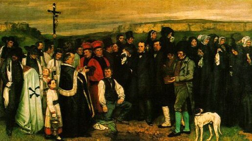 Это полотно длиной 6.7 метра, расположенное в главном зале Музея Орсе, погружает зрителя в себя, как будто он или она находятся в пещере. В явно неклассической композиции фигуры бродят в темноте, не сосредоточенные на церемонии. Являясь ярким примером реализма, картина придерживается фактов реального захоронения и избегает усиленных духовных коннотаций. Подчеркивая временную природу жизни, Курбе намеренно не позволил свету в картине выразить вечное. В то время как закат мог бы выразить великий переход...