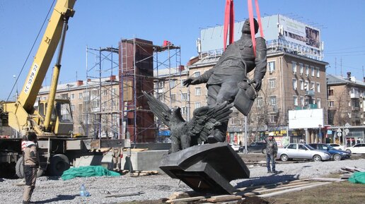 В Новосибирске продолжаются работы по реконструкции площади Маркса. Сегодня, 13 апреля, на новое основание, построенное в центре транспортного кольца, установили 6-метровую скульптуру героя Великой Отечественной войны, маршала авиации Александра Покрышкина. Как это было – смотрите в нашем фотоотчёте. Неделю назад на площади Маркса в Новосибирске с помощью автокрана с постамента сняли бронзовую скульптуру легендарного лётчика Александра Покрышкина. Потом её уложили на землю на огороженной территории по соседству и отмыли с помощью щелочного раствора...