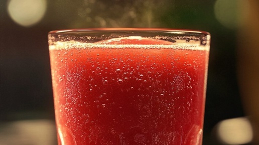 Создано на основе запроса: A realistic photo of a glass of strawberry fruit juice on a wooden table, the juice is vibrant red and looks thick and sugary. In the background, there are sugar cubes scattered next to the glass, emphasizing the high sugar content. The glass is sweating from the cold, with droplets of condensation on the outside. The scene is well-lit with natural light coming from the side, giving a fresh yet indulgent feel...