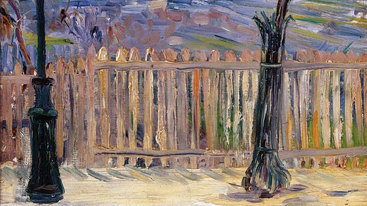 Поль Синьяк (1863–1935) снова изображает трансформацию знакомого ему пейзажа. У него была студия на улице Оршам, всего в нескольких шагах от улицы Коленкур. Деревянный забор, грядки с овощами и ветряные мельницы демонстрируют традиционный сельский облик Монмартра, но уже положен тротуар, а уличный фонарь стоит рядом с тонким деревом, защищенным решёткой. Перед нами самая большая ветряная мельница Монмартра — Moulin du Blute-Fin или Moulin Debray, более известная как Мулен де ла Галетт. Как и в «Дороге в Женвилье» (см...