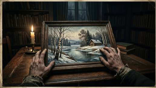 Зима в тот год выдалась лютая. Я сидел в своём кабинете, где свеча едва теплилась, а за окном метель выла, будто стая голодных волков. На столе лежало полотно — подарок от старого друга, художника Ильи Андреевича. Он принёс его неделю назад, сказал: «Егор Петрович, взгляните. Может, Вам понравится». Я тогда лишь кивнул, не особо вглядываясь. А теперь… теперь что‑то в нём не давало мне покоя. Я поднёс свечу ближе. Картина вроде обычная — пейзаж за городом, речка, берёзы, изба на пригорке. Но линии… линии были слишком чёткими, слишком выверенными...