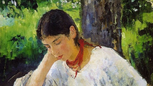 Valentin Serov – Portrait of A.Simonovich The picture was painted in 1889. Картина была написана в 1889 году. In the painting, there is a girl who is reading a book in nature. It can be seen that firstly she took a seat for a while because she did not settle comfortably for reading. But, apparently, the book gripped her so strongly that she was drawn into the reading process without noticing that her position produced discomfort...
