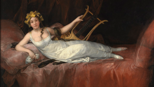 Я пишу о людях, чей #образ_отражен_в_искусстве. В мадридском Прадо можно увидеть портрет маркизы Санта-Крус кисти Франциско Гойя, изображенной им полулежащей и с лирой в руке. Дама одета в открытое белое платье, на голове золотой венок. Понятно, что она тут портретирована в образе какой-то античной героини, и таковой является муза лирической поэзии Эвтерпа. То есть, это маркиза в образе Эвтерпы. Она лежит на канапе в довольно-таки напряженной позе, расслабленностью тут не пахнет. Милое лицо девушки серьезно и даже выглядит немного испуганным, как будто ее застали врасплох...
