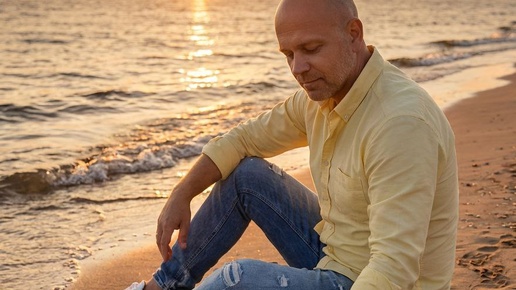загруженного изображения для точной передачи лица и прически. Одежда: Он одет в современный западный стиль — повседневную легкую желтую рубашку в сочетании с синими потертыми джинсами и белыми стильными кроссовками. Сидя на песке у берега, он нежно рисует пальцем сердце. Внутри сердца написано кириллицей имя «любимым подписчикам». Его взгляд спокоен и задумчив, отражая тихий, романтический момент, когда волны мягко приближаются к берегу...