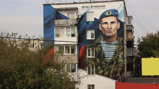 Образ Олега Ермакова украшает торец пятиэтажного дома по переулку Полесскому 1...