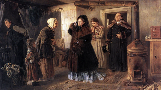 На этой картине мы видим бедную семью, которая проживает в довольно скромном жилище. Судя по шторке в углу, пожилая семейная пара и две их дочки снимают здесь угол. Дом отапливает железная буржуйка, которая неказисто встроена в стену. Кроме жильцов дома на картине есть ещё два персонажа: богатая дама и её лакей. Что же они здесь делают? А пришли дворяне в бедную семью в целях благотворительности. В то время было модно посещать бедных и кое-чем помогать им. Правда, такая помощь, в основном, была поверхностной и глобальных проблем не решала...
