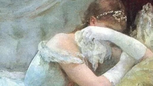 Ясно и по названию картины, написанной в 1879 году, и по парадной одежде двух главных героев, что они только что вернулись с бала. Но что-то пошло не так.... Посмотрите, какое на молодой женщине красивое зелено-голубое платье, она осыпана драгоценностями. На ней красивые шелковые перчатки. Она расстроена, лежит, уткнувшись лицом в подушку и, похоже, плачет. А может и просто делает вид, что в печали.... Рядом сидит угрюмый мужчина. Супруг, наверное. Выглядит он гораздо старше своей суженой. Может быть, причина этой ссоры - валяющийся на полу букет...