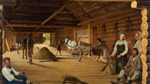 Мой провал в том, что я ничего особо странного не увидел в этой картине. А странного, оказалось по прочтении работы Михайлина и Беляевой, очень много. «…на полу ни соринки, в середине рабочего дня персонажи заняты чем угодно, только не тяжелым крестьянским трудом… на женщине праздничная, не рабочая одежда (как и на второй бабе, стоящей у противоположного края картины), а под правой рукой лежит совершено неуместный на гумне серп (вторая баба держит в руке точно такой же). Лопата в гору зерна воткнута не лопастью, а рукоятием...