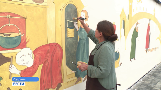 Суздаль продолжает готовится к официальному празднованию своего юбилея. И уже начал получать первые подарки. Например, Повесть о себе. В красках. Мария Городская продолжит. - У нас здесь история про то, как было бы хорошо, если бы всё было хорошо. Крупными мазками художник Татьяна Флёнова продолжает писать "Повесть о Суздале". Задача сложная - закончить орнаментальную полосу нужно к началу августа. И чтобы съёмочная группа не тормозила важный творческий процесс, разговор с Татьяной продолжаем, не отходя от стены...