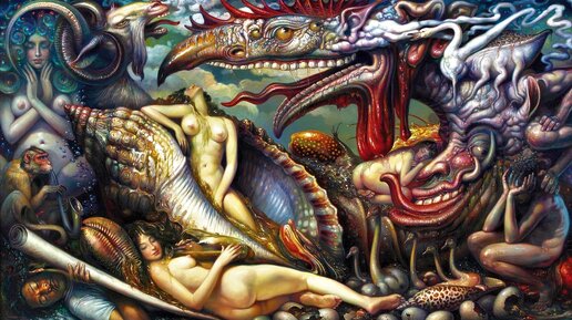 В оригинале эта картина 165*300 см, что, конечно же, очень сильно меняет воспрятие. В реальности она выглядит пугающе и завораживает. Художник крайне точно передает состояние влажности и создается ощущение, что с картины вот вот начнет стекать слизь, в которой перемазаны все участники композиции...