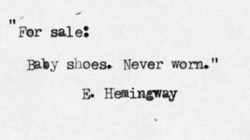 Существует популярная история о том, как однажды Хемингуэй поспорил, что сочинит самый трогательный рассказ всего из нескольких слов. И выиграл спор, написав: «Продаются детские ботиночки. Неношеные». Оказалось, что впервые эта фраза возникла в 1917 году, а современный вариант фразы появился в 1991 году. «For sale: baby shoes, never used». Считается, что именно эти шесть слов Хемингуэй написал на салфетке, следуя условиям пари: создать короткий рассказ, в котором была бы завязка, кульминация и развязка...