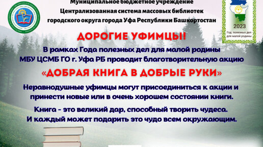В Уфе в Год полезных дел для малой Родины, объявленный в 2023 году, пройдет благотворительная акция «Добрая книга в добрые руки». Жителям столицы предлагают принять в ней участие, отдав в дар в библиотеки книги. Акцию проводит Централизованная система массовых библиотек. - Бумажная книга остается актуальным подарком и не теряет своей ценности даже в век технологий, - говорят сотрудники организации. - У многих из вас есть хорошие, но уже прочитанные книги...