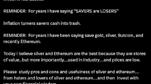 🤔 Роберт Кийосаки: «В своей книге «Пророчество Богатого Папы» я предсказал крупнейший крах в мировой истории. Этот крах произойдёт в этом году» «Пенсионные накопления бэби-бумеров будут уничтожены. Многие из них окажутся бездомными или будут жить в подвалах у своих детей. Печально. Я много лет предупреждаю всех, кто готов слушать: не храните «бумажные» активы. Инвестируйте в реальные активы. Годы повторяю: «Те, кто просто копит, — проигрывают». Инфляция превращает наличные сбережения в мусор...