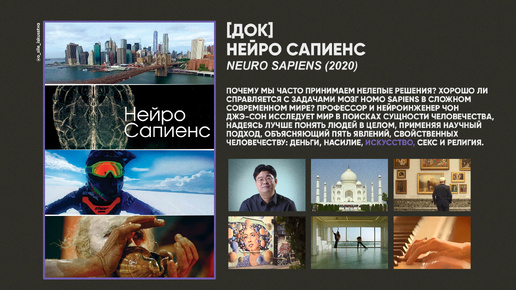 Что движет человеком, когда он пишет симфонию, рисует на стенах пещеры или замирает перед картиной? Почему мы - Homo sapiens, единственный из всех живых видов, вкладываем усилия в создание объектов, не имеющих явной практической пользы? Эти вопросы становятся центральными в эпизоде «Искусство» южнокорейского документального сериала «Нейро сапиенс» / «Neuro Sapiens» (реж. Ли Ми-соль, 2020), где ведущий — нейроучёный Чон Джэ-сон (JEONG Jae Seung / 정재승) — погружает зрителя в удивительный синтез эстетики, биологии и культурной эволюции...