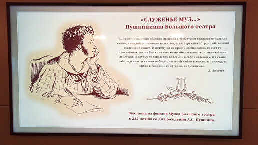 225-летию со дня рождения А.С. Пушкина Большой театр посвятил выставку из своих фондов "Служенье муз". Большой театр постоянно обращается к творчеству великого поэта. В репертуаре театра в разное время можно было слушать оперы «Руслан и Людмила», «Борис Годунов», «Евгений Онегин», «Пиковая дама», «Мазепа», «Сказка о царе Салтане», «Золотой петушок», «Русалка» и другие. Можно было видеть балеты «Бахчисарайский фонтан», «Кавказский пленник», «Медный всадник», «Онегин», две «Пиковые дамы» и другие...