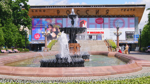 Вот мы и оказались на Пушкинской площади, одной из самых известных площадей Москвы. В 1961 г. на ней был построен театр «Россия» по проекту группы архитекторов во главе с Юрием Шевердяевым. Это один из первых образцов советского модернизма. Особо выделяется устремленный вверх, взлетающий козырек крыши, обилие лестниц и мостиков для переходов, а если бы не было афиш, то мы бы увидели сплошной стеклянный фасад. Одним из оригинальных решений стала лестница, перекинутая через автомобильный проезд и связавшая фойе театра с пешеходной зоной бульвара...