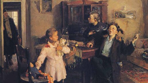 На этой картине мы видим троих детей, которые собрались в комнате за столом. Вот только приход мамы почему-то не на шутку испугал одного из них. Давайте попробуем разобраться, что же здесь происходит. Картина написана художницей Раисой Кудревич в соавторстве с живописцем Адольфон Гугелем. Оба мастера в своём творчестве неоднократно обращались к детской теме. Не стала исключением и картина «Большой сюрприз», написанная в 1950 году. На картине художники изобразили сцену в обычной советской квартире...