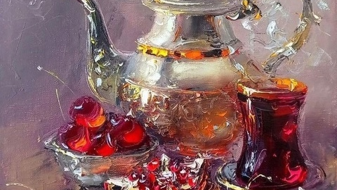 До чего же вкусный натюрморт! Такие яркие, сочные, красивые краски! К тому же все блестит и переливается. Даже воздух переливается, потому что из чайника идет парок. Чайник такой интересный, в восточном стиле...