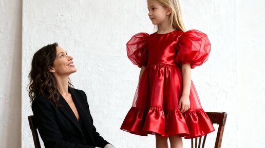 #семейный 1. заходим в Бот 2. выбираем nano banana 3. прикрепляем ваше фото где хорошо видно лицо и вставляем промпт: minimalist studio portrait: mother in black pantsuit seated on a vintage wooden chair, smiling up and holding her daughter standing barefoot on the seat. Girl with wavy hair wears a vivid red organza/taffeta dress with voluminous puff sleeves and a bell skirt...