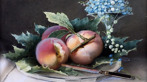 Андрей Алексеевич Редковский (1831—1909), русский художник, интерьерный живописец, пейзажист, акварелист, академик Императорской Академии художеств. "Персики и цветы", 1895