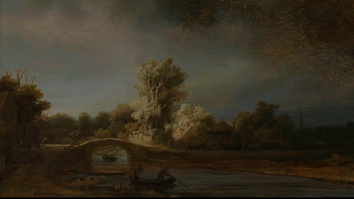 Картина Рембрандта Картина написана Рембрандтом в 1638 году на доске масляной краской На картине изображен каменный мост и лодка рыбаков,действие скорее всего происходит в деревенском поселении Картина храниться в Рейксмюзеум в Амстердаме...