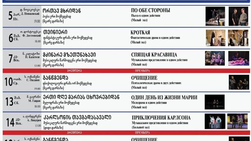 5 декабря, 19:00: «По обе стороны» (пьеса в одном действии). Билеты от 25 лари. 6 декабря, 18:00: Фантастическая драма «Кроткая». Билеты от 25 лари. 7 декабря, 13:00: «Спящая красавица» (музыкальное представление в одном действии). Билеты от 20 лари. 10 и 19 декабря, 19:00: Премьера: «Очищение» (психологическая драма в одном действии). Билеты от 25 лари. 13 декабря, 18:00: «Один день из жизни Марии» (мелодрамма в одном действии). Билеты от 25 лари. 14 декабря, 13:00: Сказка «Капризная принцесса»...