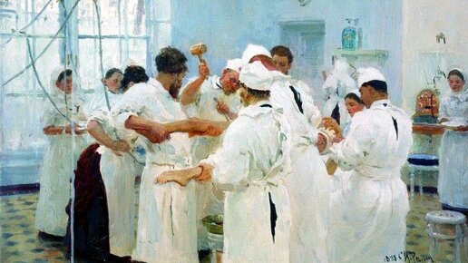 На этой картине мы видим хирургическую операцию в больнице, которая явно проводится не в наше время. Об этом говорит одежда медицинского персонала, инструменты, обстановка операционной и многое другое. На самом деле действие сюжета происходит в конце XIX века, а главным героем картины является хирург Евгений Васильевич Павлов. Репин и Павлов были близкими друзьями. Художник часто гостил в доме врача, а его дочь Надя проходила в больнице Павлова хирургическую практику. При необходимости Илья Ефимович обращался к Евгению Васильевичу и за медицинской помощью...