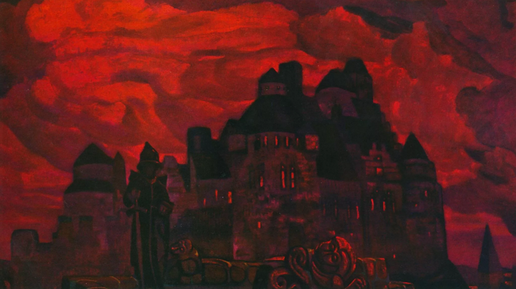 Еще одна картина Н.К. Рериха «Зарево» с предвидением грозных исторических событий. Картина производит на человека достаточно глубокое и тяжелое впечатление. На картине отражен старый замок на фоне огненного неба. В окнах которого видны отраженные отблески зарева. Огненное небо является предвидением скорой войны, а красные краски символизируют будущую революцию. Старый замок на картине символизирует старый уходящий мир. Неизбежность ухода которого с исторической арены ощущается в цветовой палитре картины...