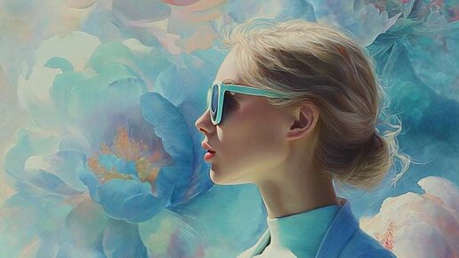 MidJourney ⤵️ Ultra-realistic portrait of a woman in profile walking through a dreamy, surreal landscape of large, softly glowing flowers. She is wearing a light turquoise outfit, matching sunglasses, and holding a cup of drink. Her skin is flawless, smooth with a porcelain-like texture, and her hair is styled in a soft, natural way. The background consists of oversized flowers in shades of blue, pink, and peach, with delicate, soft lighting creating a tranquil, ethereal atmosphere...