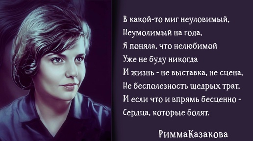 Демон и ангел хрустальнейший – двое в смертельном бою, кто победит в том ристалище, видя лишь правду свою? Я не оракул пророчества, слепо рискну головой. Но, даже если захочется выйти из схватки живой, буду без сна и без жалости биться, чтоб мне повезло. Знать бы лишь только: сражаешься ты за добро или зло? (Римма Казакова) Она очень быстро стала своей в компании шестидесятников – рядом с Евтушенко, Рождественским, Ахмадулиной, Окуджавой, Вознесенским; была признана молодыми, но уже состоявшимися поэтами за яркую индивидуальность, непохожесть и, что совсем немаловажно, соответствие времени...