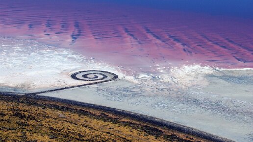 «Спиральная дамба» Роберта Смитсона — одно из самых известных произведений Лэнд-арта (об этом направлении искусства я подробнее рассказала тут). Она была создана в 1970 году на Большом Солёном озере в штате Юта. Это озеро обладает необычным свойством — оно двухцветное, почти поделённое пополам. Северная часть озера — розовая, южная — зелено-голубая. Линия, разделяющая озеро — железнодорожные пути. В результате их появления нарушился водообмен, что и привело к такому контрасту. В северной части озера вода стала более соленой, там выжили микроорганизмы, которые дали воде розовый оттенок...
