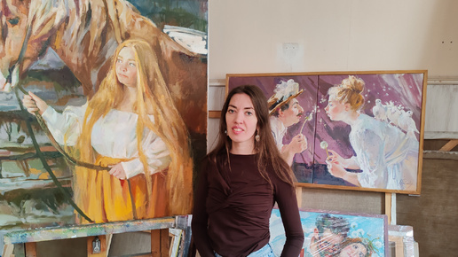 Девушка на картине «Купила Дуня порося» холст масло 110х110см 2022 Художник: Мария Родинская