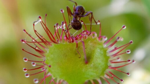 Росянка - такое растение, которое навсегда остается в памяти из школьной программы ботаники. Плотоядное растение - это что-то из ряда вон выходящее. Росянка клейкими капельками приклеивает к себе комара, муравья или другое насекомое, а потом заворачивает в листочек и спокойно растворяет, переваривает. Вообще видео этого процесса напоминает сюжет об инопланетных формах жизни. Даже не верится, что на нашей родной Земле есть такие странные, загадочные, невероятные растения. Вот нашла видео на просторах интернета, полюбуйтесь...