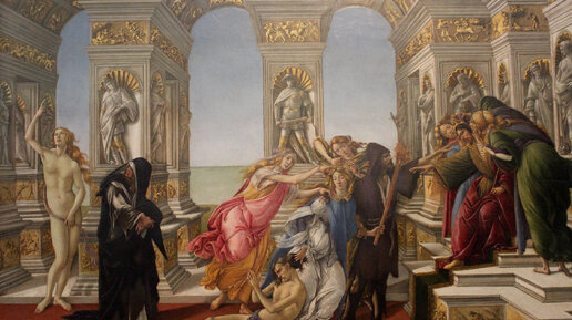 Эта весьма необычная поздняя сцена в карьере Сандро Боттичелли (годы жизни 1445-1510) имеет почти сюрреалистический характер, с её богато украшенной обстановкой, пустым небом и аллегорическими человеческими фигурами. Работа является конечным результатом попытки Боттичелли воссоздать безвременно утраченную картину древнегреческого художника Апеллеса (годы жизни 352-308 до нашей эры), описанную в известном тексте римского писателя Лукиана (годы жизни 125-180-ые нашей эры), указывающую на восхищение Боттичелли классическим художественным искусством...