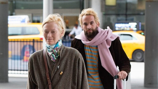 Тильда Суинтон, 58 лет, и ее бойфренд- художник Сандро Копп, 41 год, замечены в аэропорту Нью-Йорка.