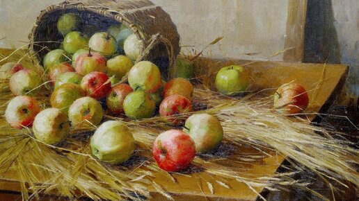В честь августа небольшая вкусная яблочная подборка. Начину от соблазнительных натюрмортов и завершу прекрасным семейным досугом в виде сбора яблок. Натюрморт с яблоками "Натюрморт с яблоками" был написан в 1909 году Сычковым Федотом Васильевичем. Очень непривычно от художника видеть эту работу, так как обычно он специализировался на портретах хорошеньких веселых крестьянок. Но яблочная тема ему тоже нравилась и его фруктовые натюрморты не оставляют равнодушными. На столе находится перевернутая плетенная корзина, из которой рассыпались наливные и аппетитные яблоки...