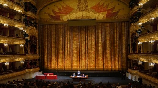 В театре прошел традиционный сбор труппы. Как мне показалось, народу сегодня было меньше чем обычно. У многих артистов (оперы, балета, миманса) репетиции. Технические службы тоже работают. Кстати, и журналистов было меньше. Или мне только это показалось. Как обычно, в начале был показан фильм, рассказывающий о прошлом сезоне. Видео в конце статьи. Потом Владимир Георгиевич подвел итоги прошлого сезона, поделился цифрами - сколько спектаклей (оперных и балетных ) было в прошлом году. Страшная цифра...