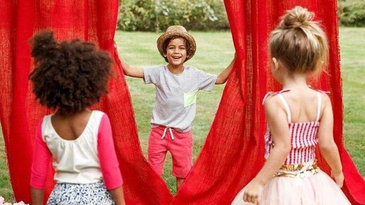 Как здорово устроить на даче летний театр, где дети смогут репетировать и показывать постановки и импровизации своим родным и близким ♥️ На самом деле это сделать не так сложно как кажется. Первый способ самый простой. Нужны две занавески (можно взять просто два полотна ткани), которые можно натянуть между деревьями или под крышей крыльца или уличной террасы. Дети обожают когда есть занавес! Занавес можно повесить на прочную веревку при помощи обычных держателей для штор или сразу сделать загиб по верхней стороне и прошить его...
