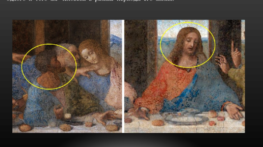 Множество картин известного итальянского художника Леонардо да Винчи наполнены тайнами и секретами, большинство которых не разгадано по сей день. Необыкновенные факты произведения "Тайная вечеря" Если верить старым притчам, то в данной картине роль Иуды и Иисуса исполнил один и тот же натурщик. Почему же художник выбрал одинаковый образ для совершенно разных, противоположных персонажей? Это вопрос до сих пор не закрыт, как и то, что никому неизвестно, кто позировал творцу. Согласно поверью, в образе Иисуса Христа мастер использовал певчего, служившего при церковном хоре...