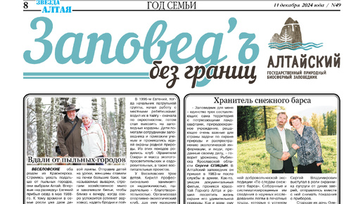 Подходит к завершению Год семьи, которым Президент объявил 2024-й. Территорией семьи можно образно определить старейшую особо охраняемую природную территорию Горного Алтая. В апреле Алтайскому государственному природному заповеднику исполнилось 92 года. И все эти девять с лишним десятков лет здесь живут и работают люди, посвятившие свою жизнь охране природы, воспитывающие в атмосфере бережного отношения ко всему живому своих детей, внуков из которых подрастает новая смена защитников Алтайской тайги и Золотого озера...