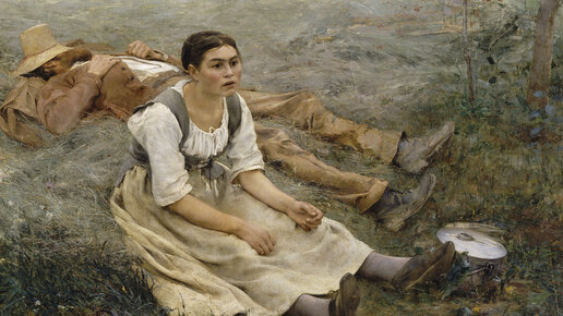 На картине «Сенокос» Жюль Бастьен-Лепаж (годы жизни 1848-1884) изображает двух крестьян, которые только что освободились от тяжёлого труда по обработке земли. На переднем плане творения сидит уставшая молодая женщина, она положила свои руки на вытянутые ноги, её плечи низко опущены. Сам художник однажды описал её так: «Моя молодая крестьянка сидит на земле, положив руки на ноги, с горячим и красным от жары лицом, её неподвижные глаза не видят абсолютно ничего, а поза девушки в край разбитая и утомлённая...