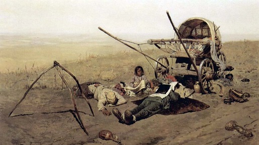 Перед нами известная картина "Смерть переселенца" художника С.В. Иванова. Я уже писал о ней в заметках Если вкратце, то шедевр Иванова сформировал у русских страх перед освоением новых земель, которым они до этого не страдали. И действительно, картина "Смерть переселенца" наводит тихий ужас (в детстве я это отчетливо ощущал), порождая стойкое желание не рисковать ради "лучшей жизни", сидеть дома, не высовываться, довольствоваться тем, что имеешь. Иначе, как этот несчастный и его семья, окажешься...