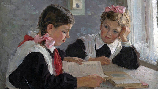 Перед нами картина советского художника Владимира Серова "Домашнее задание" 1956 года. Что мы видим на этой картине? Две школьницы, находясь дома у одной из девочек, вместе делают домашнее задание. Это одноклассницы, они не сёстры, потому что у себя дома не ходят в школьной форме. Почему они делают домашнее задание вдвоём? Потому что раньше была такая практика "подтягивать" отстающих. Практика, надо сказать, глубоко порочная и ущербная. Отличников заставляли "тянуть" за собой отстающих. Спрашивается,...